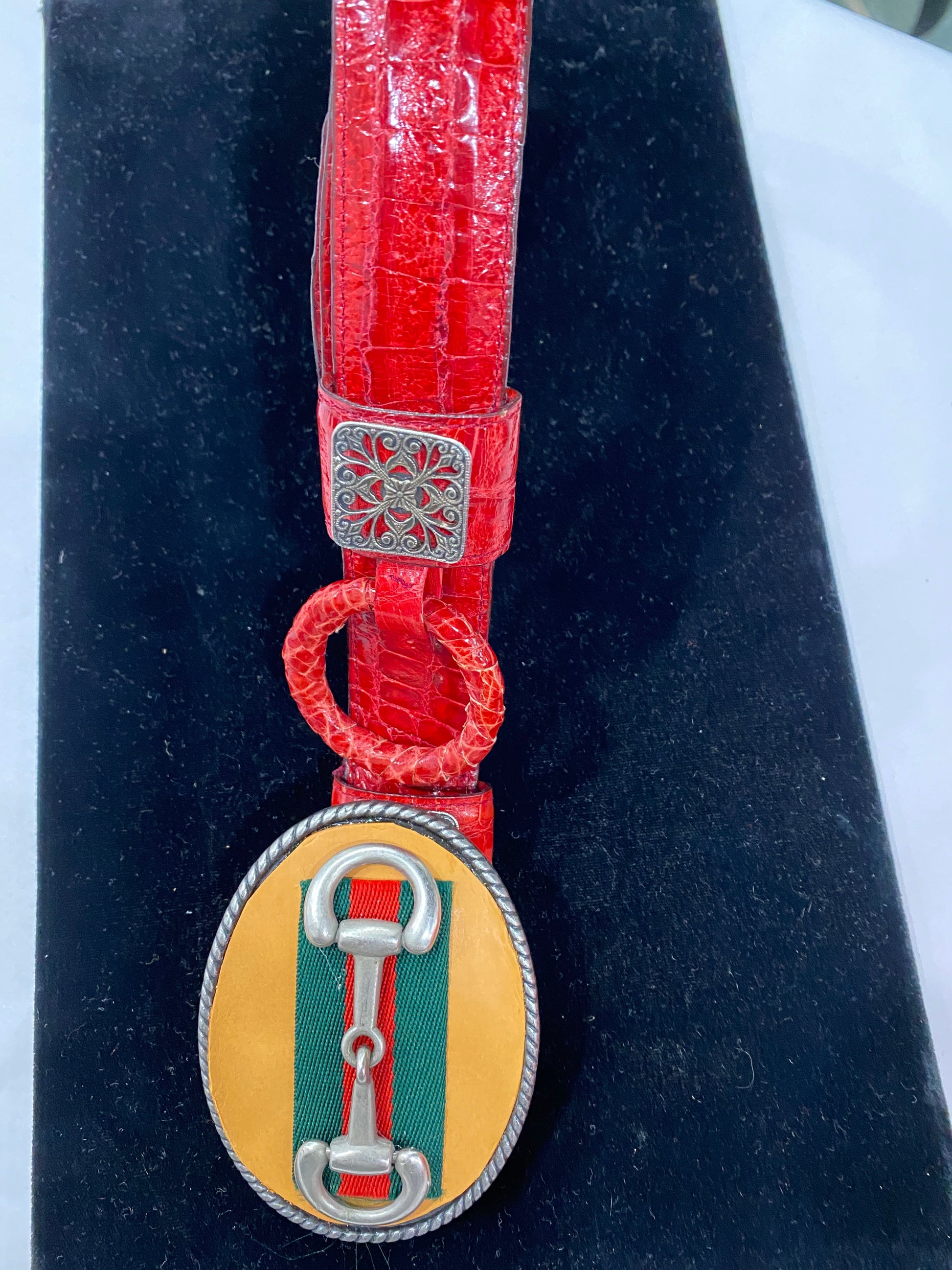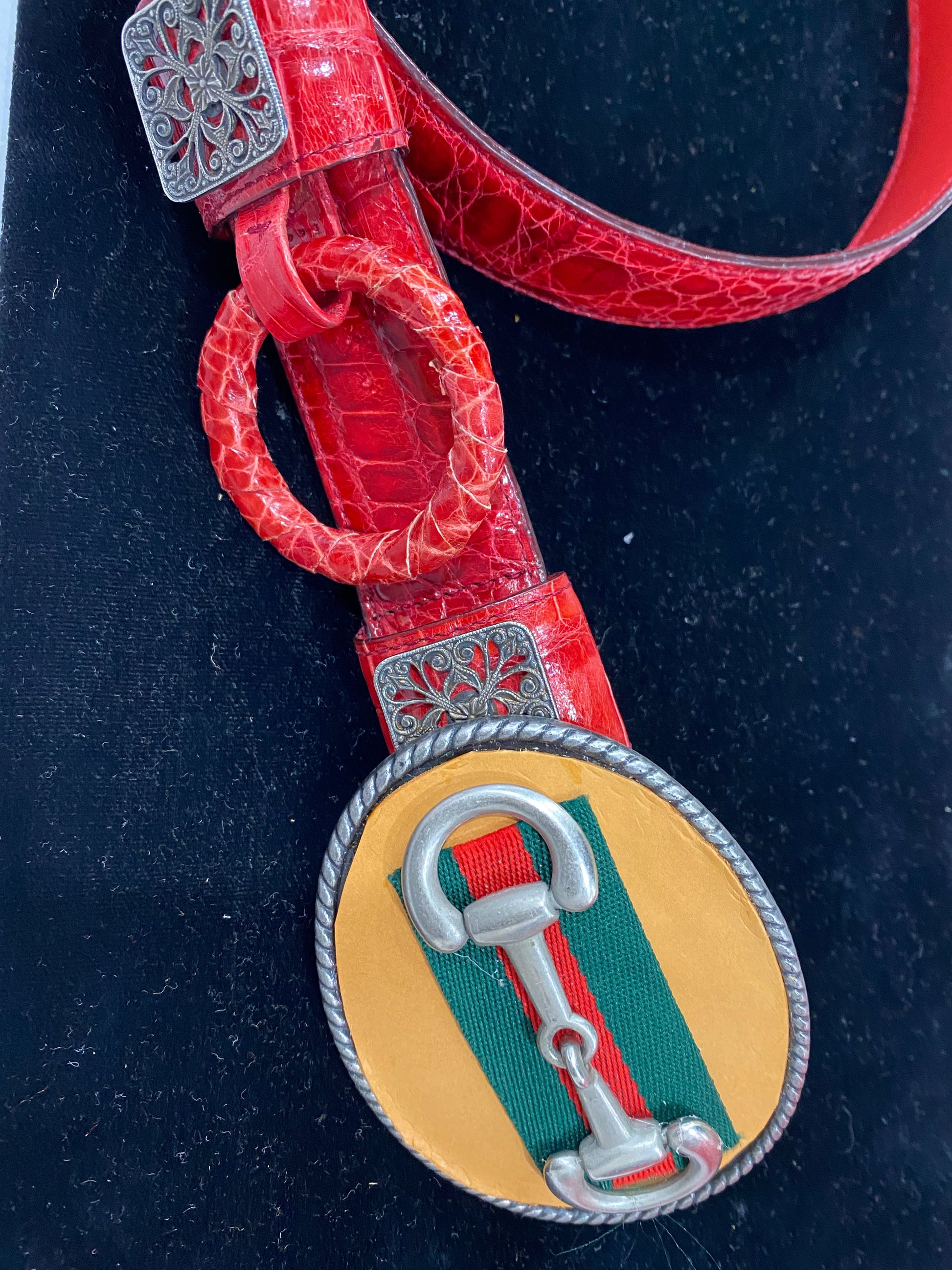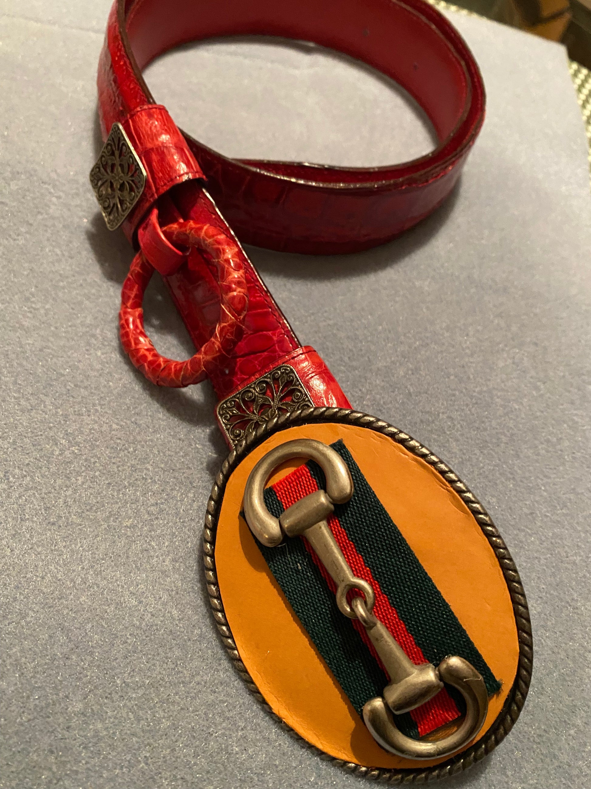 Linda Solomon Belt, Up-Cycled from Vintage Gucci parts and Red Croc. Belt with Metal Accents, this one is a Sz. XSm. Belt length 36’’ Handmade by Linda, one of a kind. Red is the new Blk.